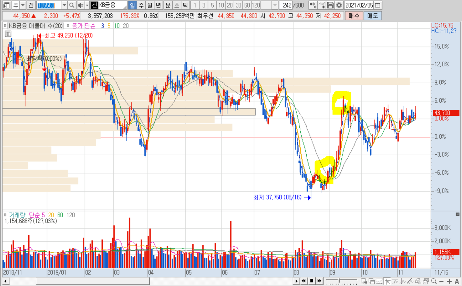 빠르게 상승이 나온 종목은 5일, 10일 이동평균선을 지지하지 못할 때 매도하고, 천천히 상승하는 종목은 5일 이동 평균선이 20일 이동평균선을 지지하지 못할 때 매도하면 좋습니다.