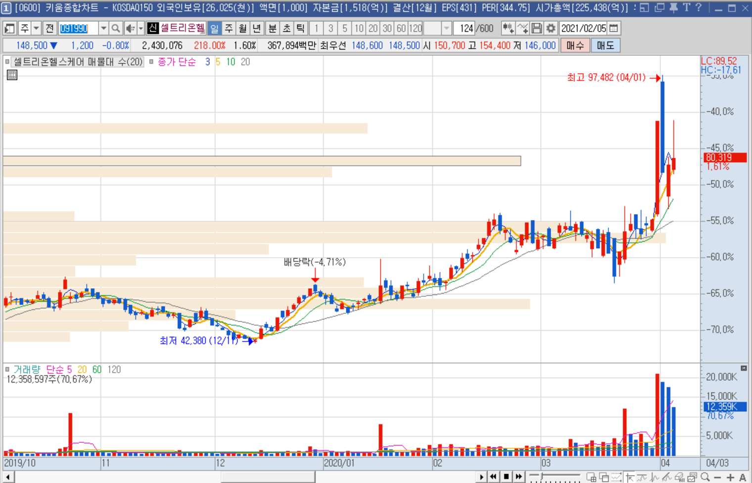 * 셀트리온헬스케어를 예로 들어보겠습니다. 차트를 보면 신고가가 나왔는데 위로 매물대가 없습니다. 때문에 매수가 매수를 불러서 관성의 법칙에 따라 어디까지 상승할지 알 수 없습니다. 하지만, 물리면 엄청난 손실을 가져올 수 있기 때문에 심적으로 타격이 크게 됩니다.